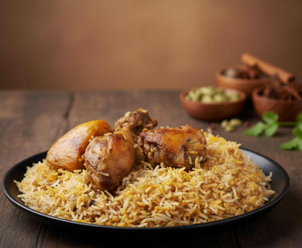 Experience the royal taste of Bengal! This fragrant Kolkata-style biryani is made with long-grain basmati rice, tender chicken pieces, and perfectly spiced golden potatoes. Each layer is slow-cooked to perfection, giving you that rich, soulful aroma and melt-in-mouth texture. Served with raita and salad (subject to availability) from Swad Safar